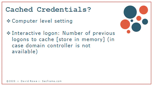 What are cached credentials? The are the stored logons of previous user accounts that logged into the workstations and servers.